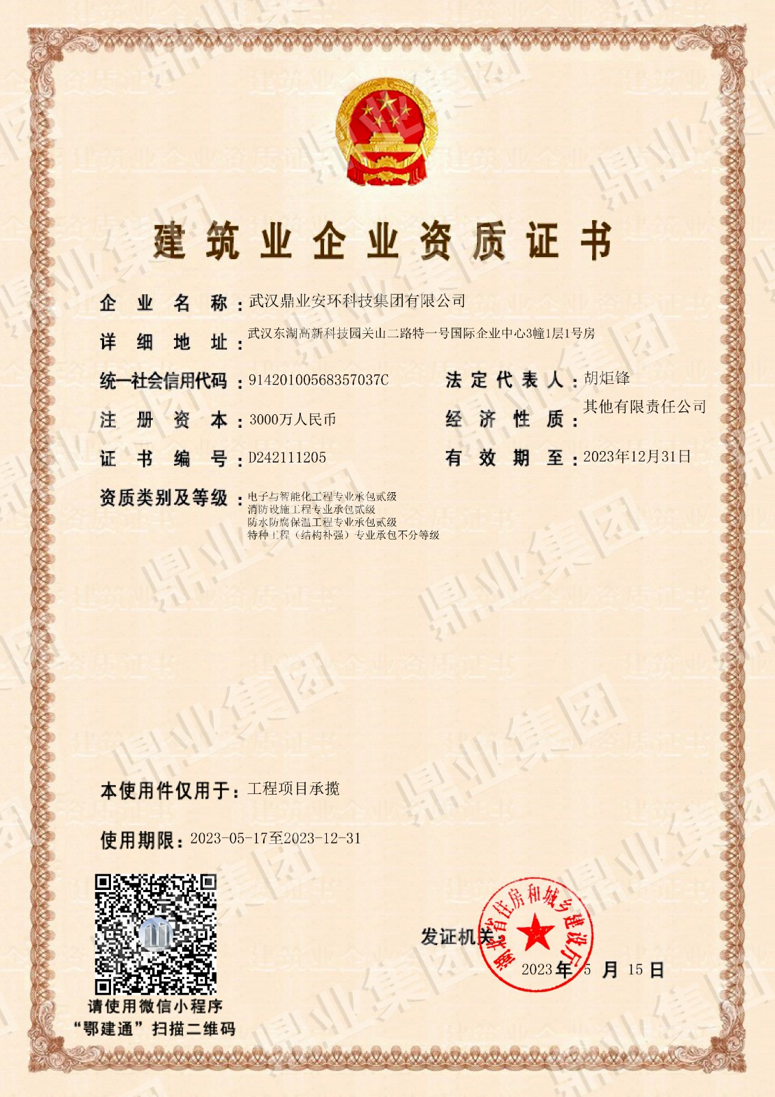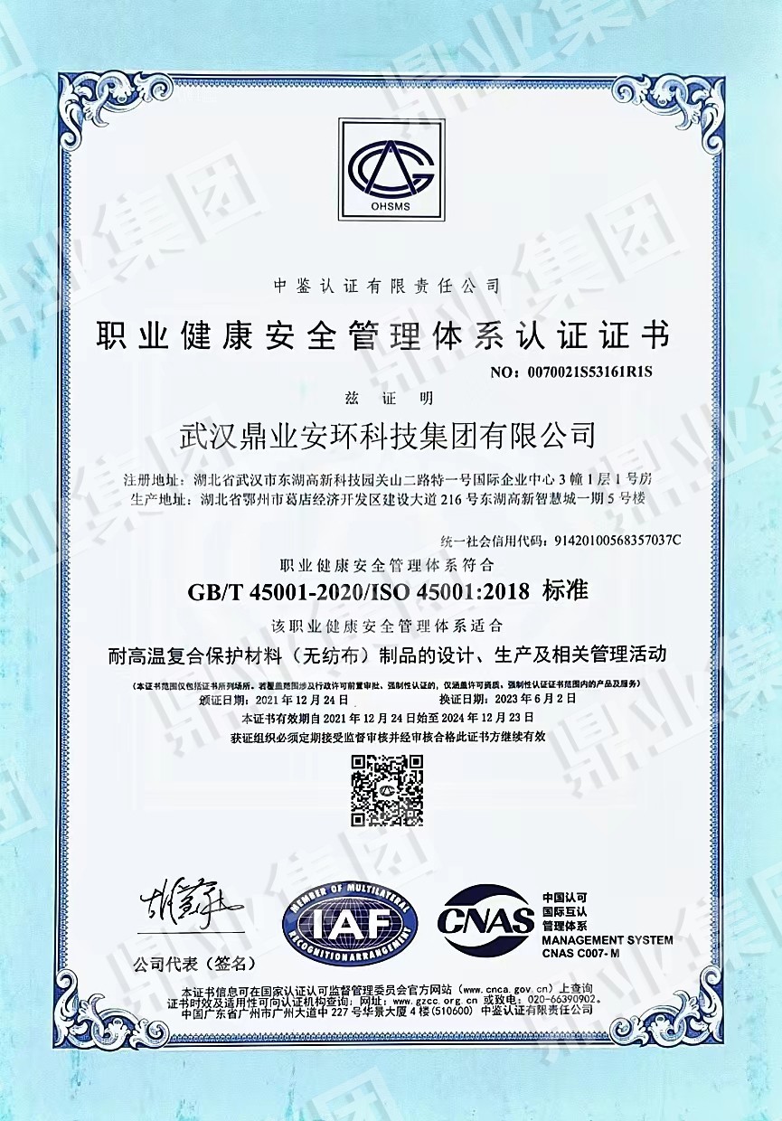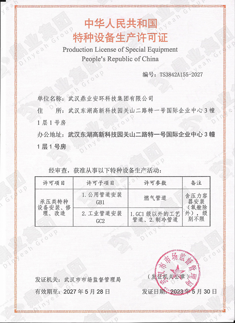 鼎業安環集團連續6年被評為武漢市瞪羚企業、高新技術企業,榮獲國家專精特新“小巨人“、“湖北金種子”、“湖北省制造業單項冠軍稱號”,武漢首批“雄鷹企業”,集團擁有158份專利和軟件著作權”。擁有環保工程專業承包二級證,安全生產許可證(二級資質工程項目承攬、施工勞務工程項目承攬),建筑業企業資質證,特種設備生產(壓力容器改造)許可證,防爆產品合格證。通過質量、環境、職業健康、安全管理體系(“QEOJ”管理體系)認證,安全生產標準化達標企業三級認證,檢驗檢測機構資質認證,知識產權管理體系認證,誠信管理體系認證,售后服務認證,社會責任管理體系認證,固廢、危廢、回收加工處理企業服務能力等級資質認證。