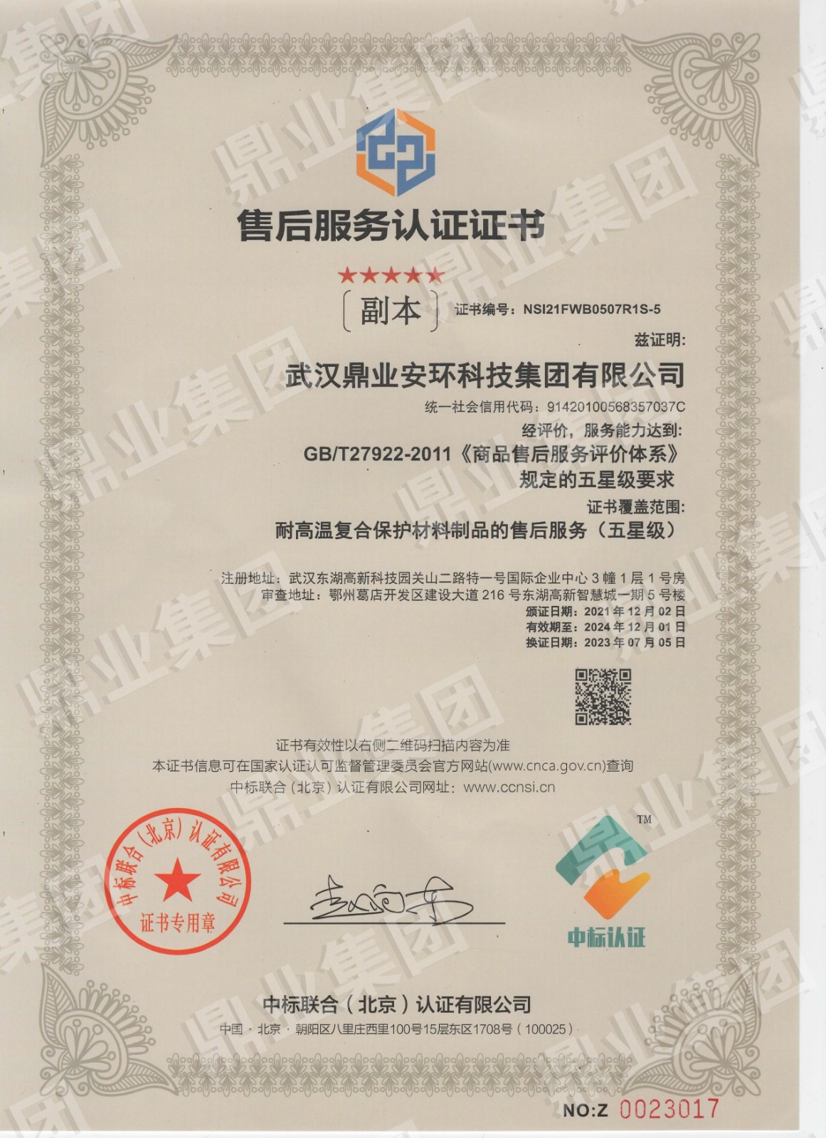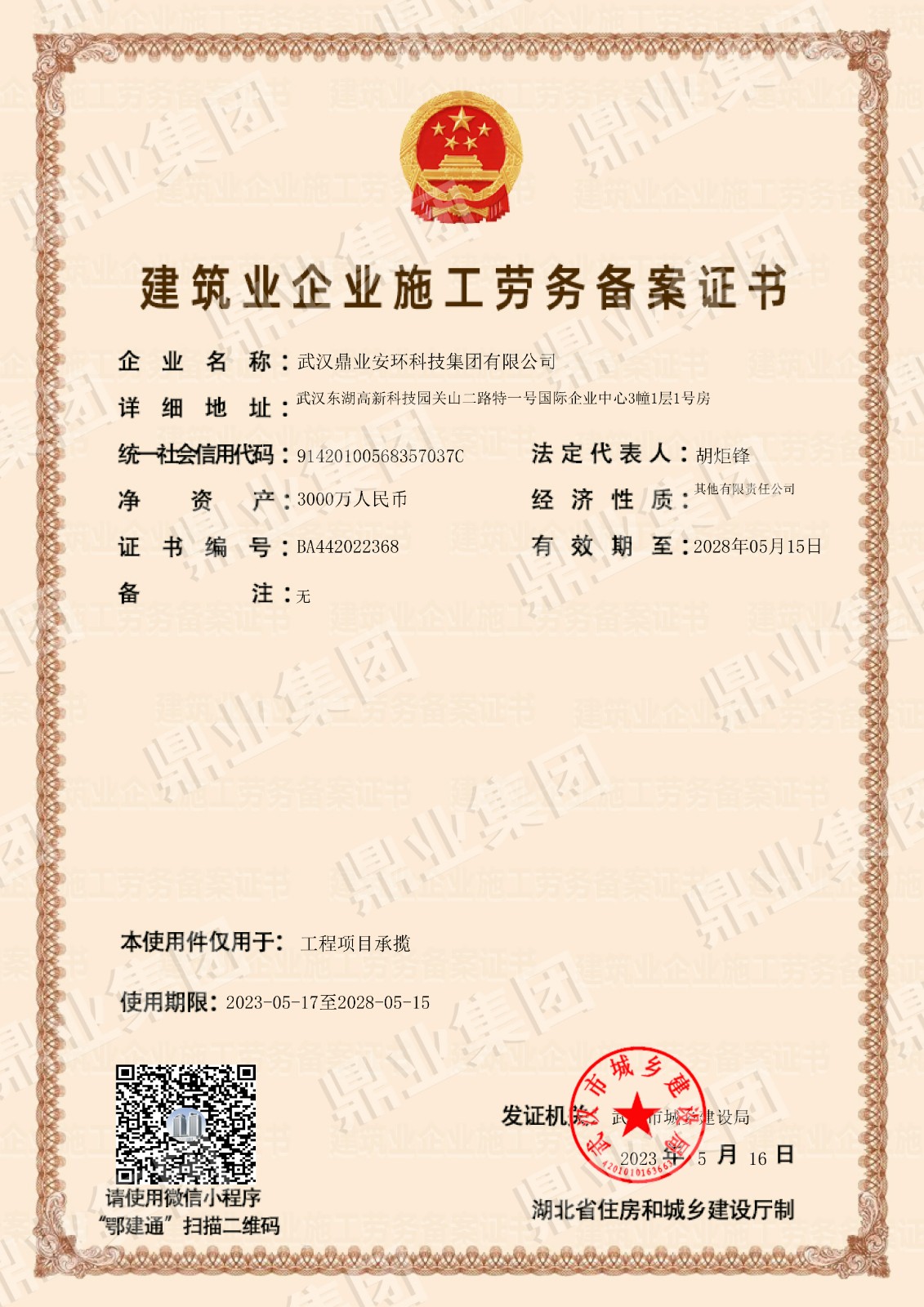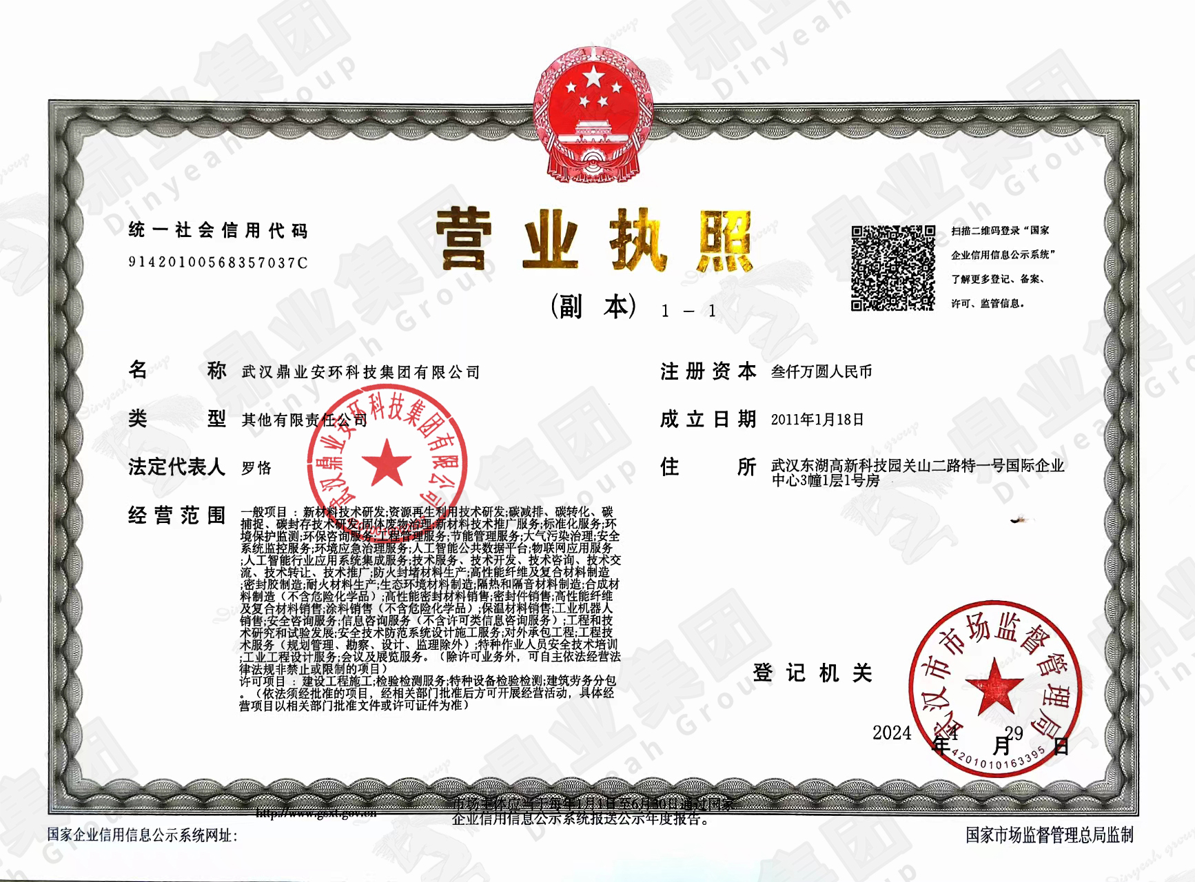 鼎業安環集團連續6年被評為武漢市瞪羚企業、高新技術企業,榮獲國家專精特新“小巨人“、“湖北金種子”、“湖北省制造業單項冠軍稱號”,武漢首批“雄鷹企業”,集團擁有158份專利和軟件著作權”。擁有環保工程專業承包二級證,安全生產許可證(二級資質工程項目承攬、施工勞務工程項目承攬),建筑業企業資質證,特種設備生產(壓力容器改造)許可證,防爆產品合格證。通過質量、環境、職業健康、安全管理體系(“QEOJ”管理體系)認證,安全生產標準化達標企業三級認證,檢驗檢測機構資質認證,知識產權管理體系認證,誠信管理體系認證,售后服務認證,社會責任管理體系認證,固廢、危廢、回收加工處理企業服務能力等級資質認證。