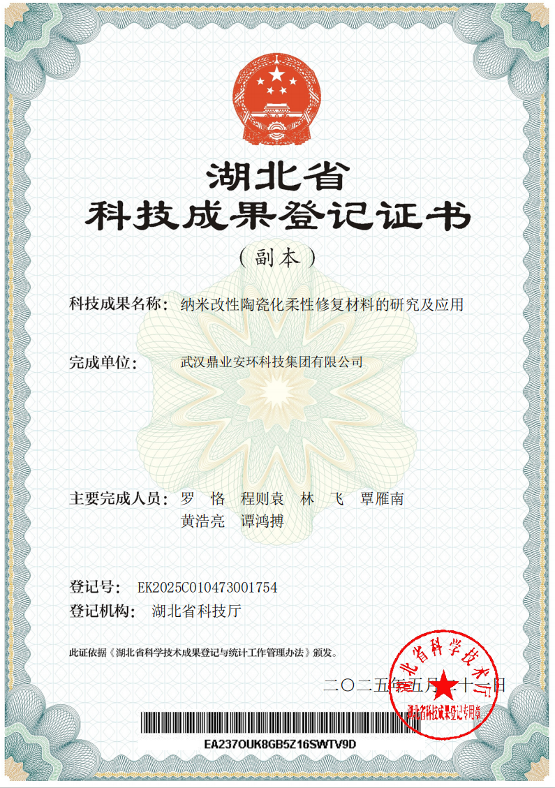 近日,武漢鼎業安環科技集團的研究項目《納米改性陶瓷化柔性修復材料的研究及應用》,榮獲湖北省科技成果登記證書。這一成果是對鼎業安環在新材料研發領域多年努力的肯定,也彰顯了其對行業技術進步的重大貢獻。