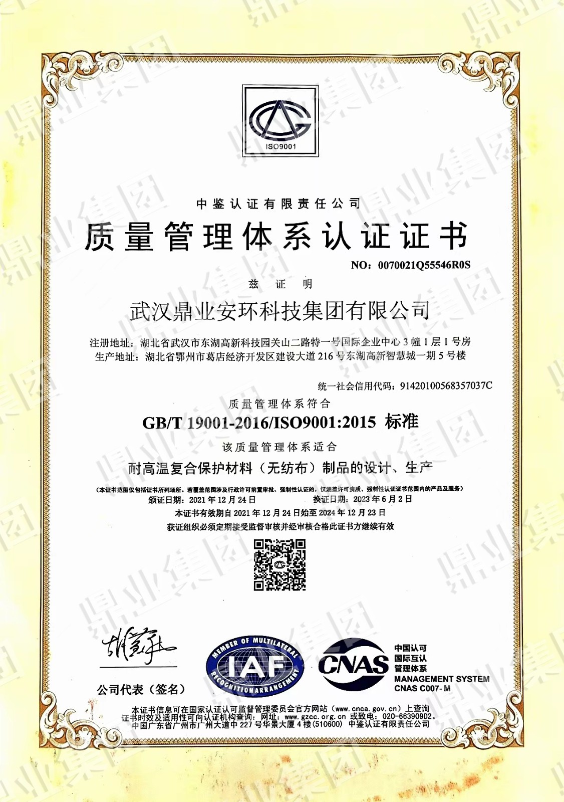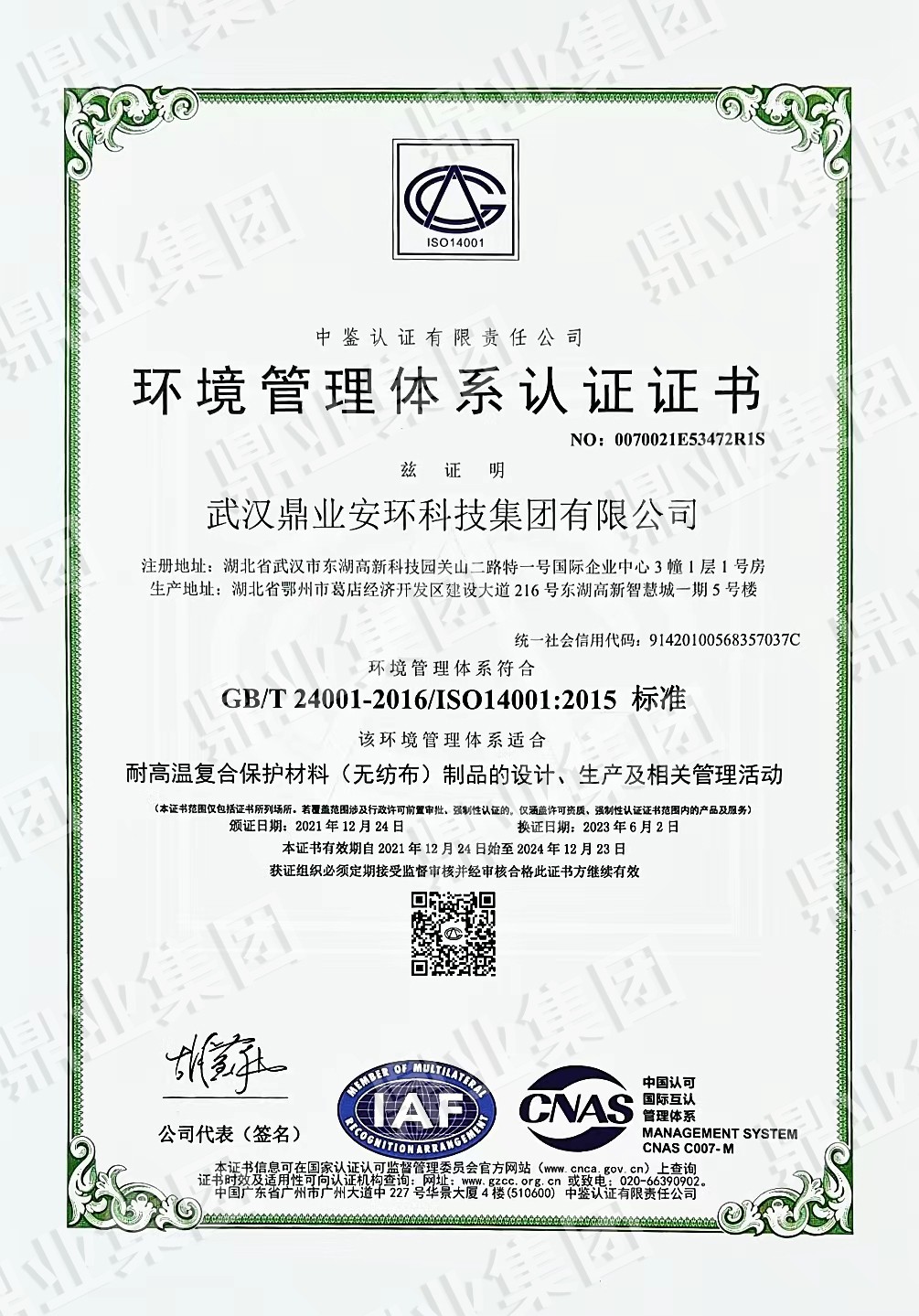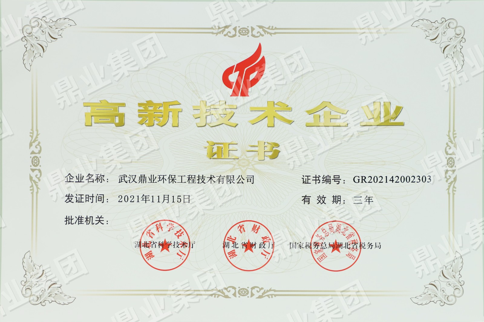 鼎業安環集團連續6年被評為武漢市瞪羚企業、高新技術企業,榮獲國家專精特新“小巨人“、“湖北金種子”、“湖北省制造業單項冠軍稱號”,武漢首批“雄鷹企業”,集團擁有158份專利和軟件著作權”。擁有環保工程專業承包二級證,安全生產許可證(二級資質工程項目承攬、施工勞務工程項目承攬),建筑業企業資質證,特種設備生產(壓力容器改造)許可證,防爆產品合格證。通過質量、環境、職業健康、安全管理體系(“QEOJ”管理體系)認證,安全生產標準化達標企業三級認證,檢驗檢測機構資質認證,知識產權管理體系認證,誠信管理體系認證,售后服務認證,社會責任管理體系認證,固廢、危廢、回收加工處理企業服務能力等級資質認證。